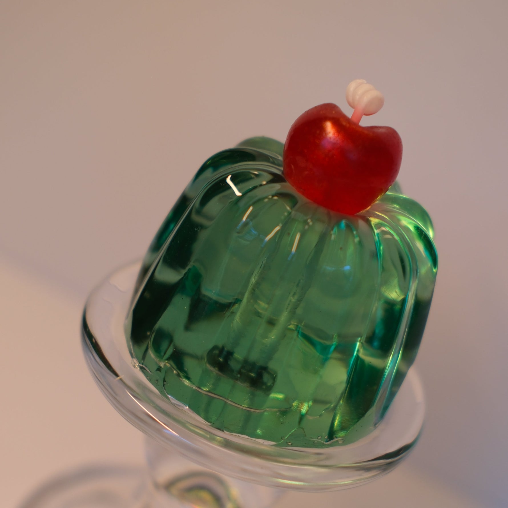 Look: A deep forest-green Canelé-shaped jelly candle with a subtle shimmer, like pine needles glistening under candlelight.