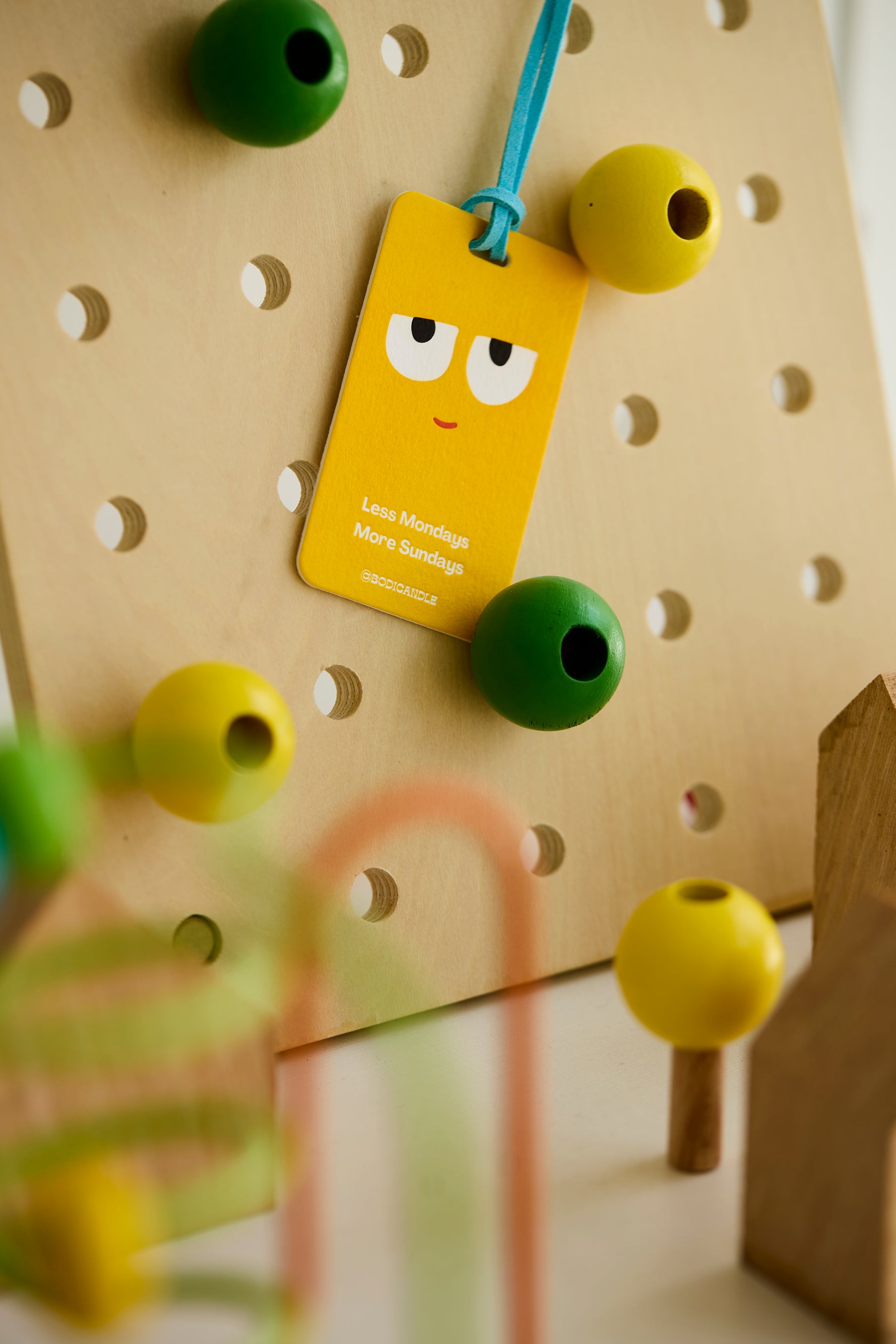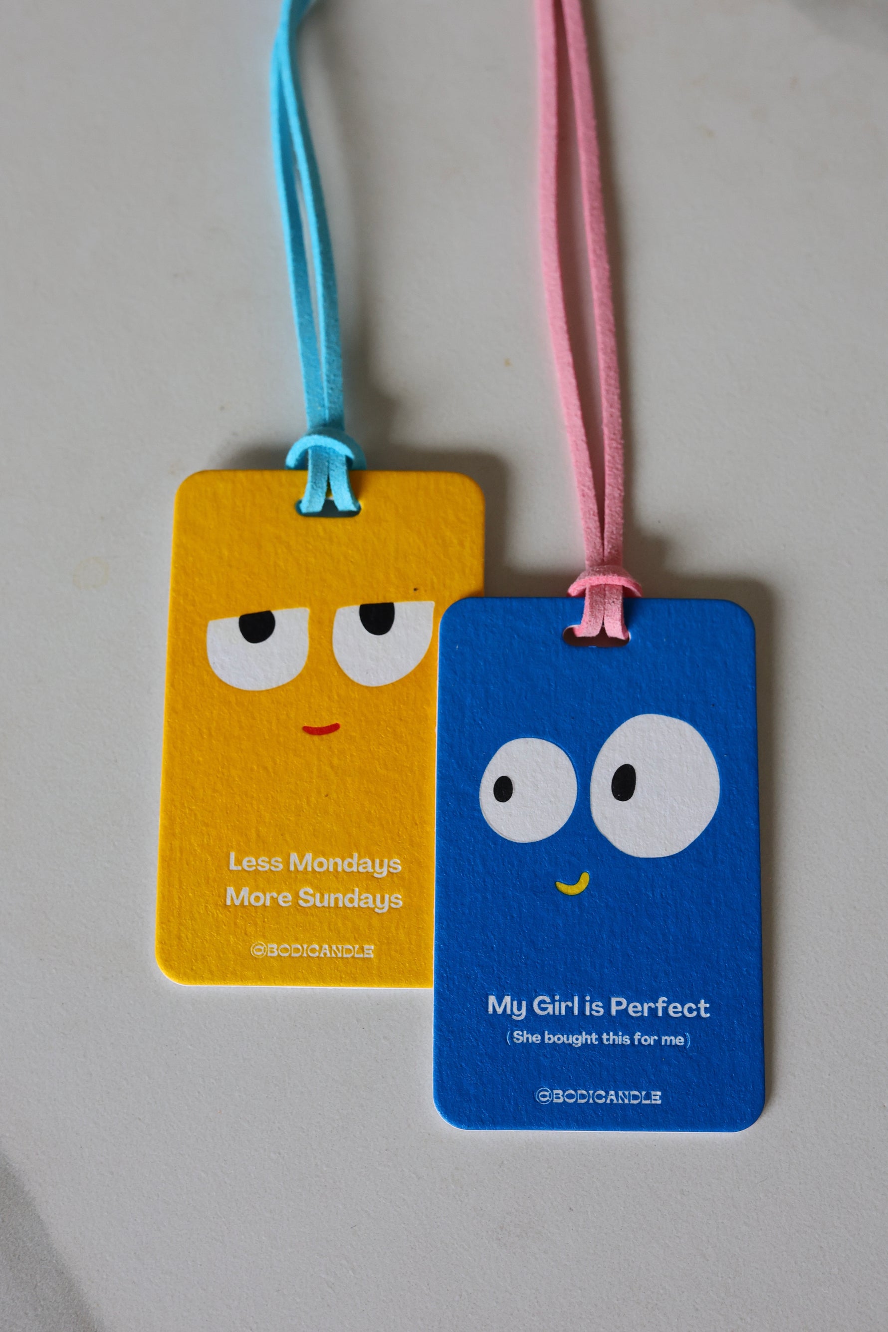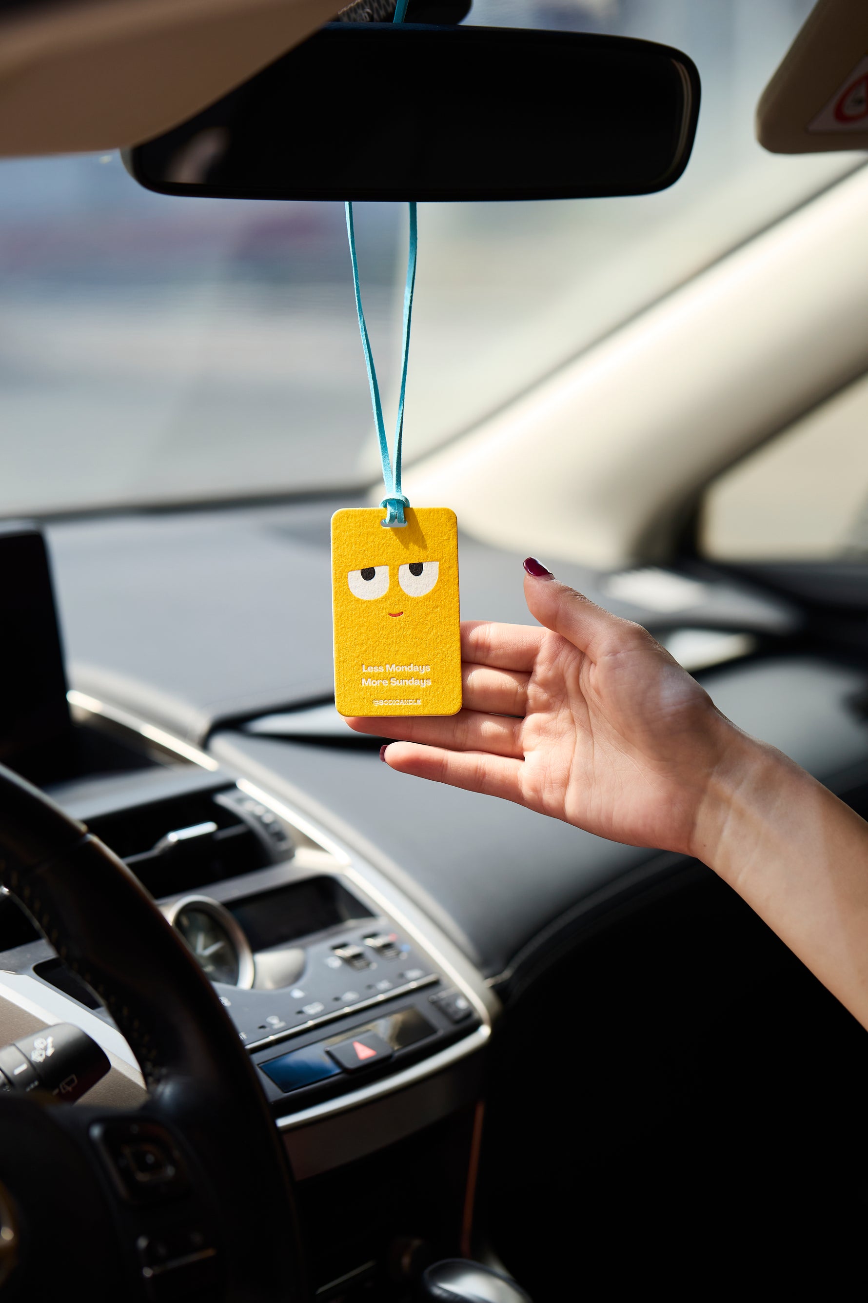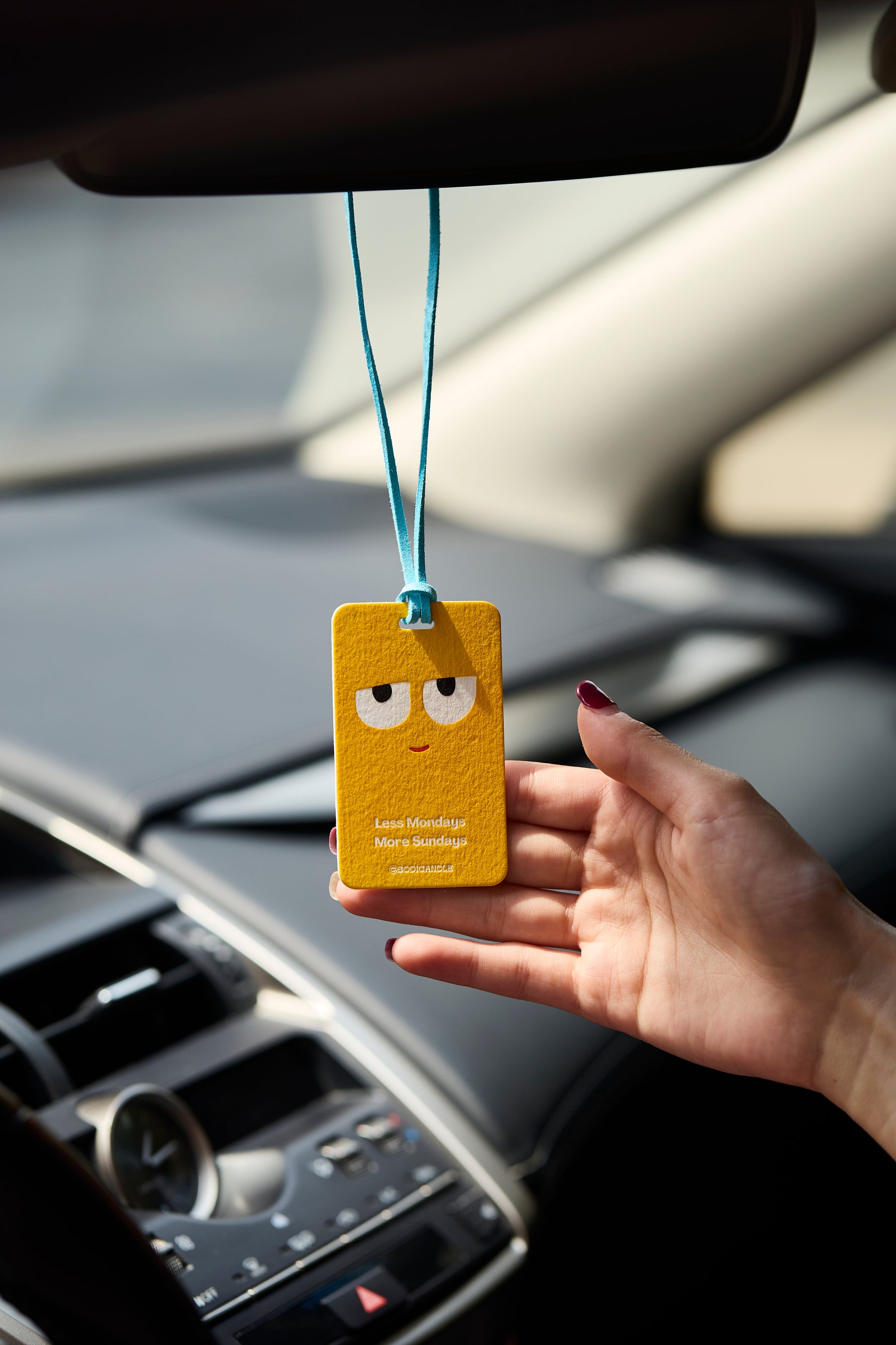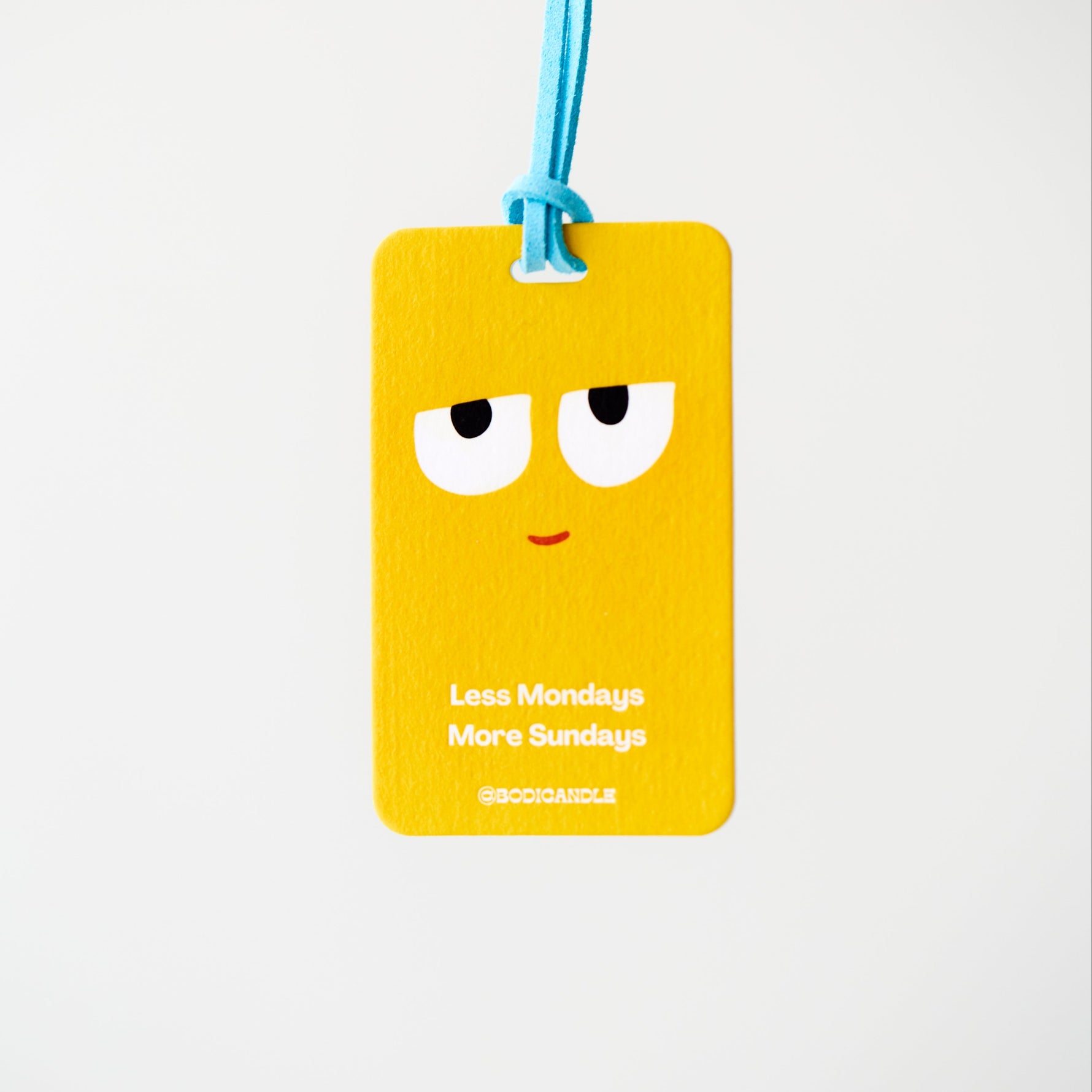 The universal mood—because we all deserve fewer Mondays and more Sundays! This bright yellow freshener features a cool, slightly unimpressed smile, because let’s be real: we’d all rather be somewhere else on a Monday. Paired with a baby blue hanging rope, it’s a vibrant and fun little pick-me-up for your car, desk, or anywhere you need a reminder to take it easy.