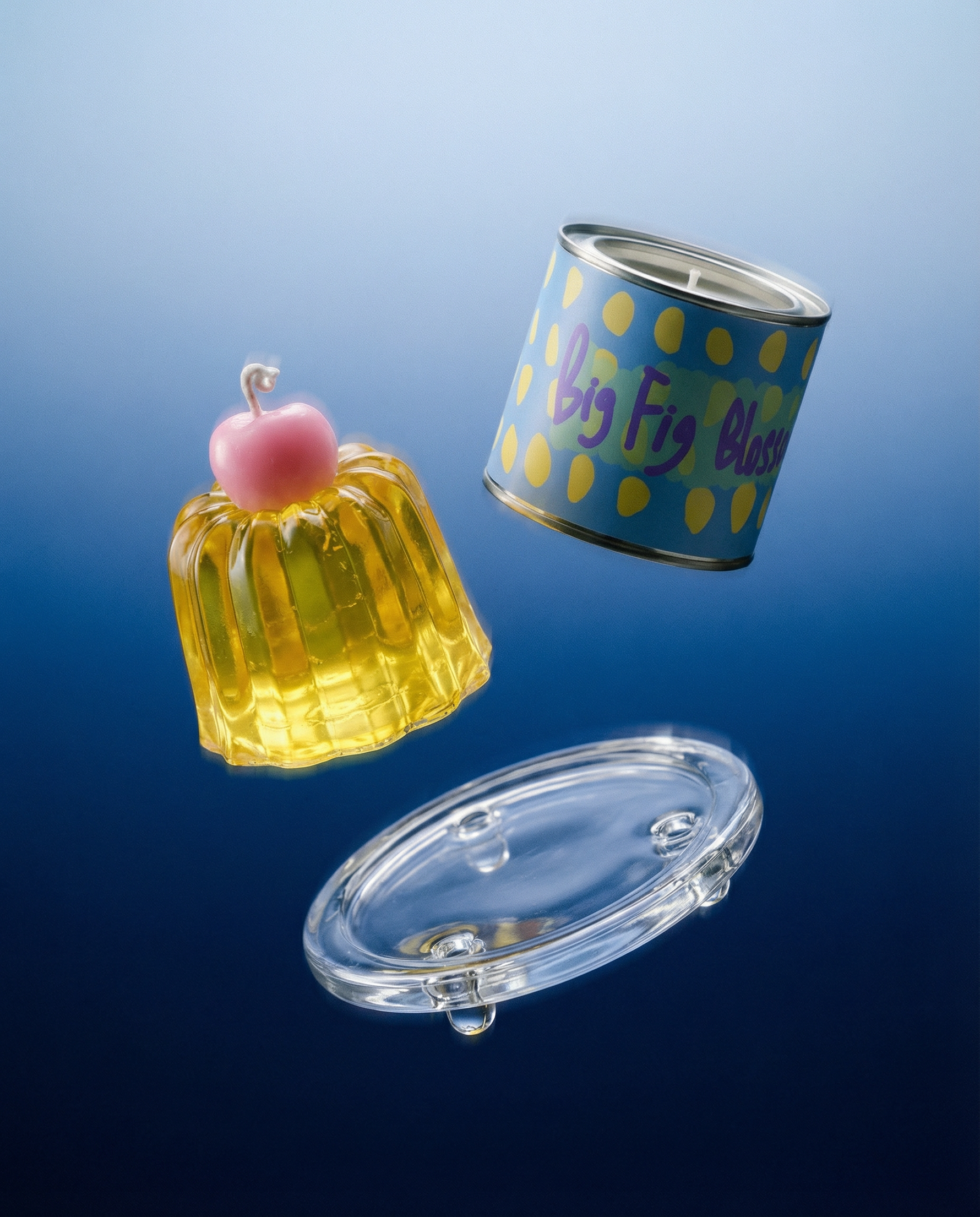 Three Jelly Canelé candles that speak in quiet emotions: a shy bloom in twilight hues, a gentle blue sky held in jelly, and a crystal canelé crowned with a ruby cherry — layered into one thoughtful gift of sweetness, calm, and depth.